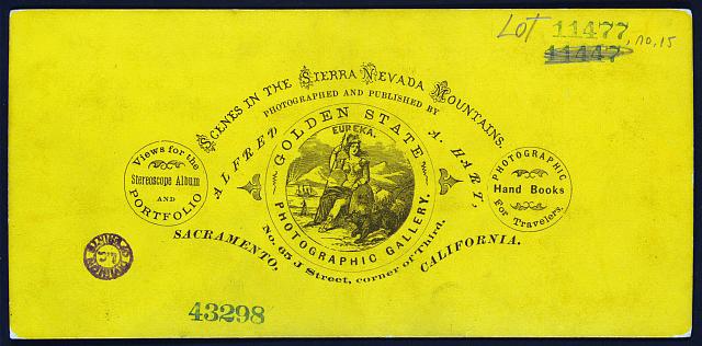 Alfred Hart 1865-1869 Backmark for "Scenes in the Sierra Nevada Mountains. Photographed and Published by Alfred A. Hart, Sacremento, California."