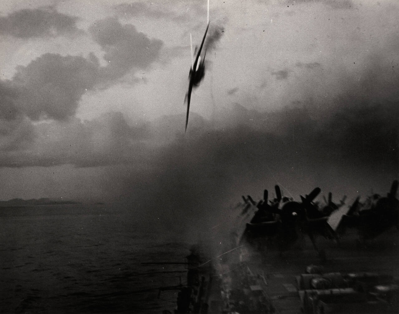On sheet verso, upper right, in pencil: "[?] p. 77, US N War Photographer, Steidien, ed. / Kimakaze [sic] misses USS Sangamon / 2,000 - G/E"; On sheet verso, center, in pencil: [? possibly a signature] 700580 / Matte".