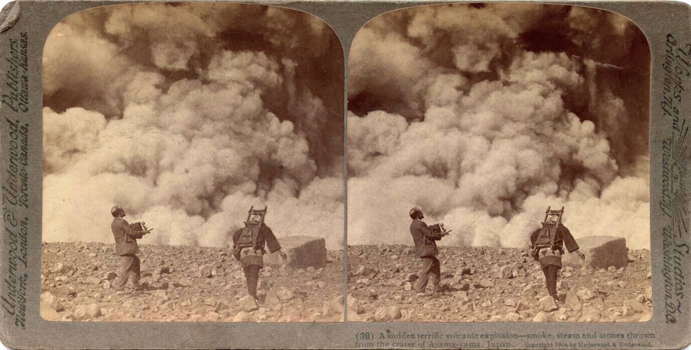 A sudden terrific volcanic eruption - smoke, steam and stones thrown from the crater of Asama-yama, Japan