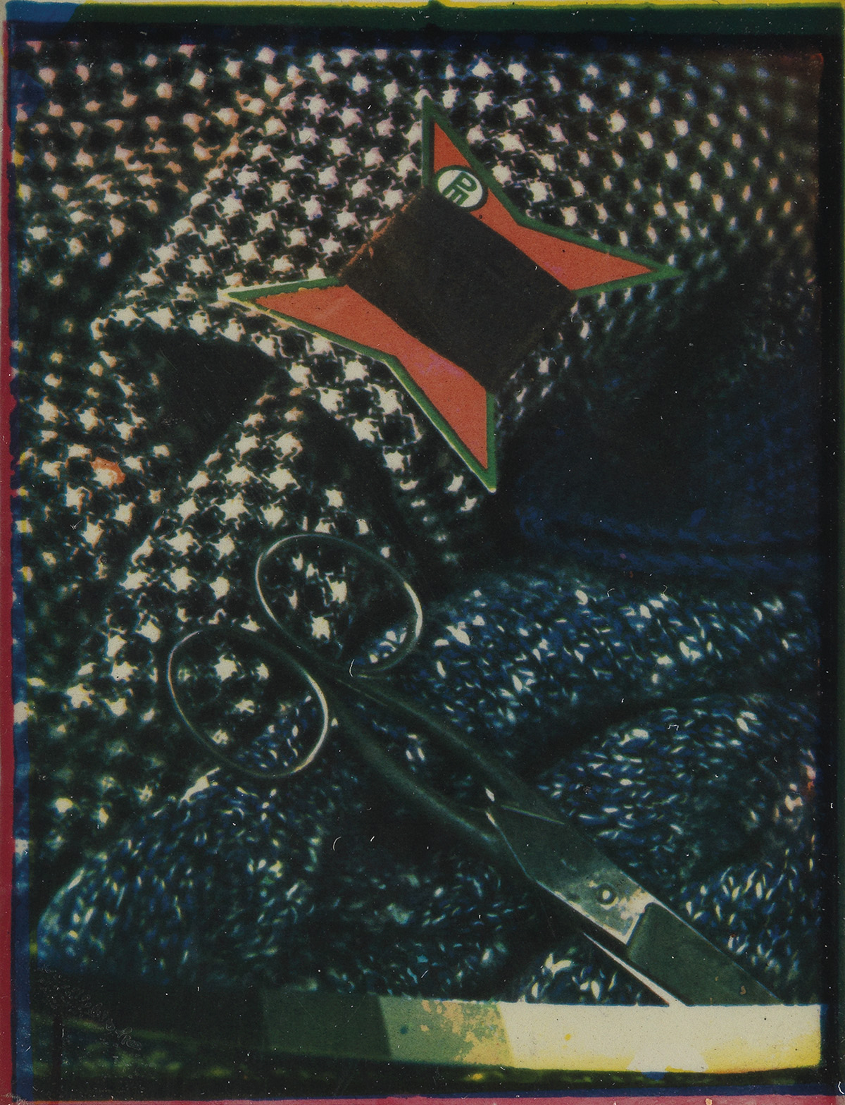 Advertising study with bolts of fabric and scissors