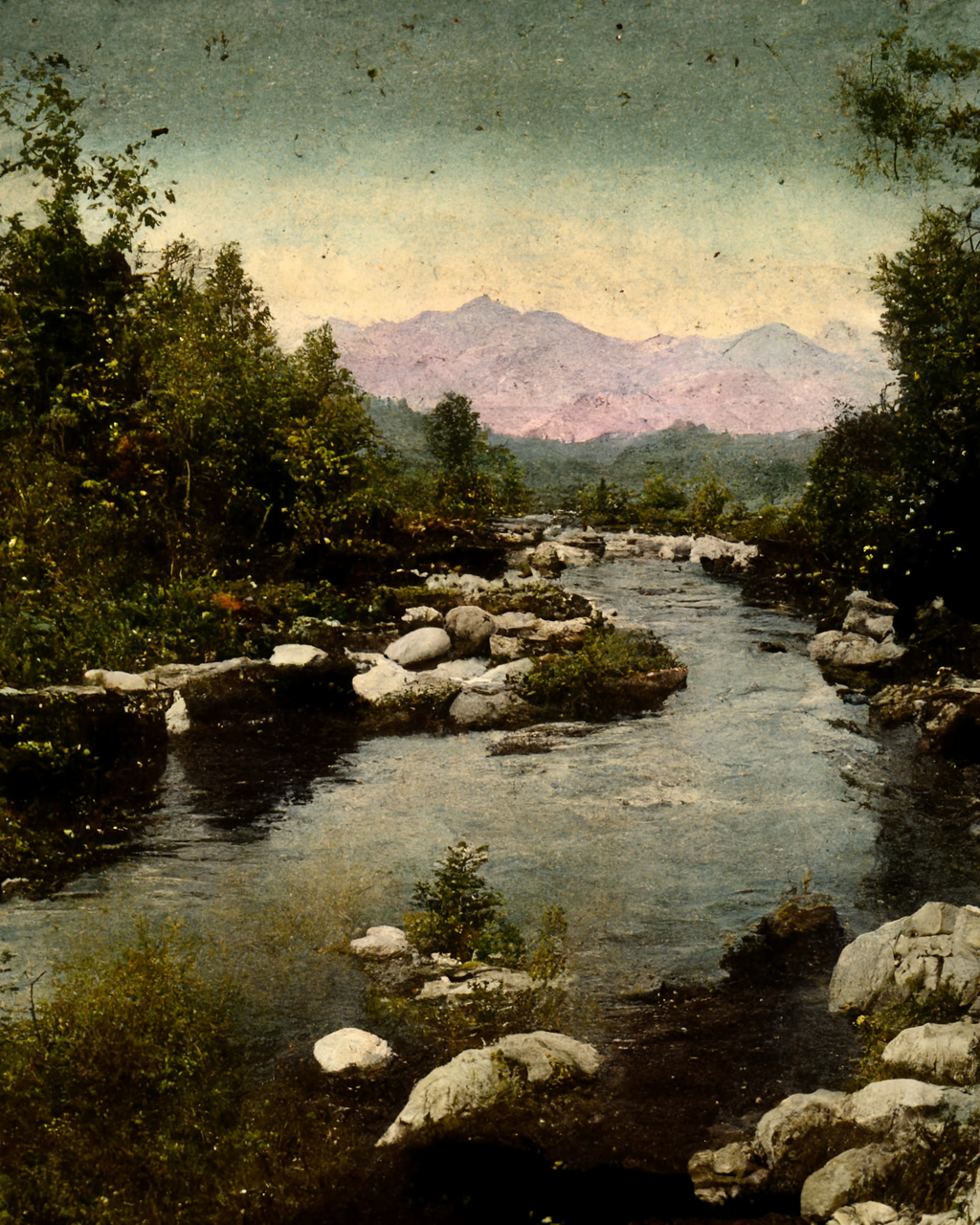 the original photo + "An exquisite, hand-colored positive, from a negative taken in the summer of 1892 , photograph of rocky river flowing to the distance with mountains and forests in the background"