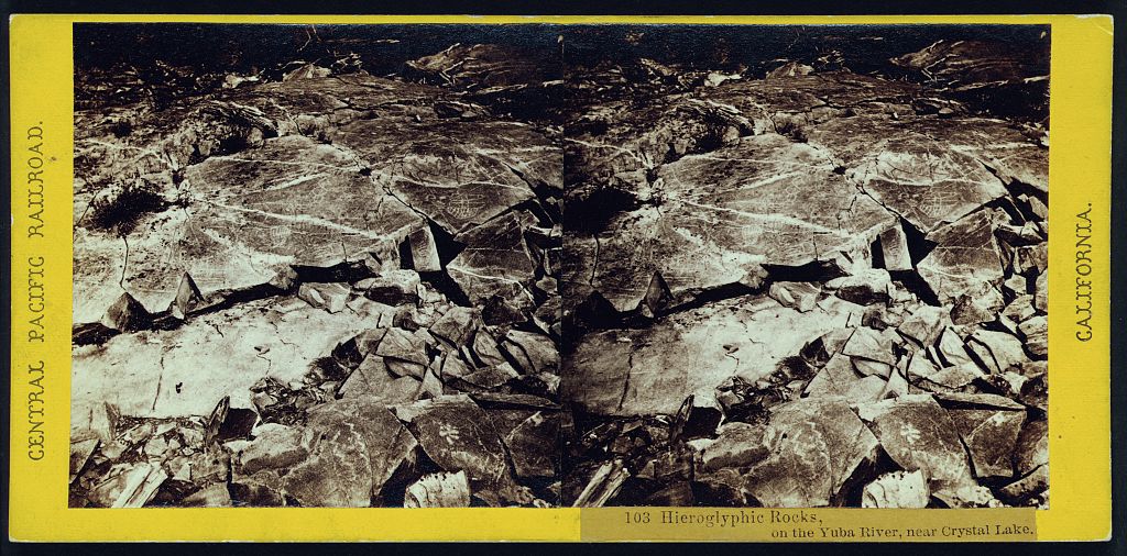 Alfred Hart 1865-1869 Hieroglyphic Rocks, on the Yuba River, near Crystal Lake [Central Pacific Railroad, California. Scenes in the Sierra Nevada Mountains. No. 103]
