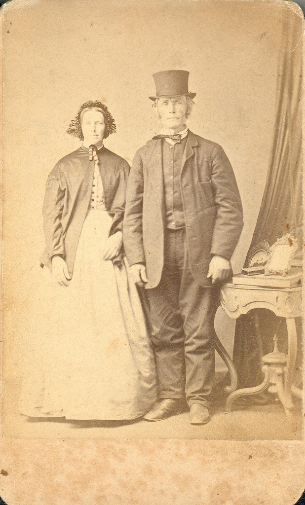 Portrait of elderly couple with framed photographs on the table beside them
