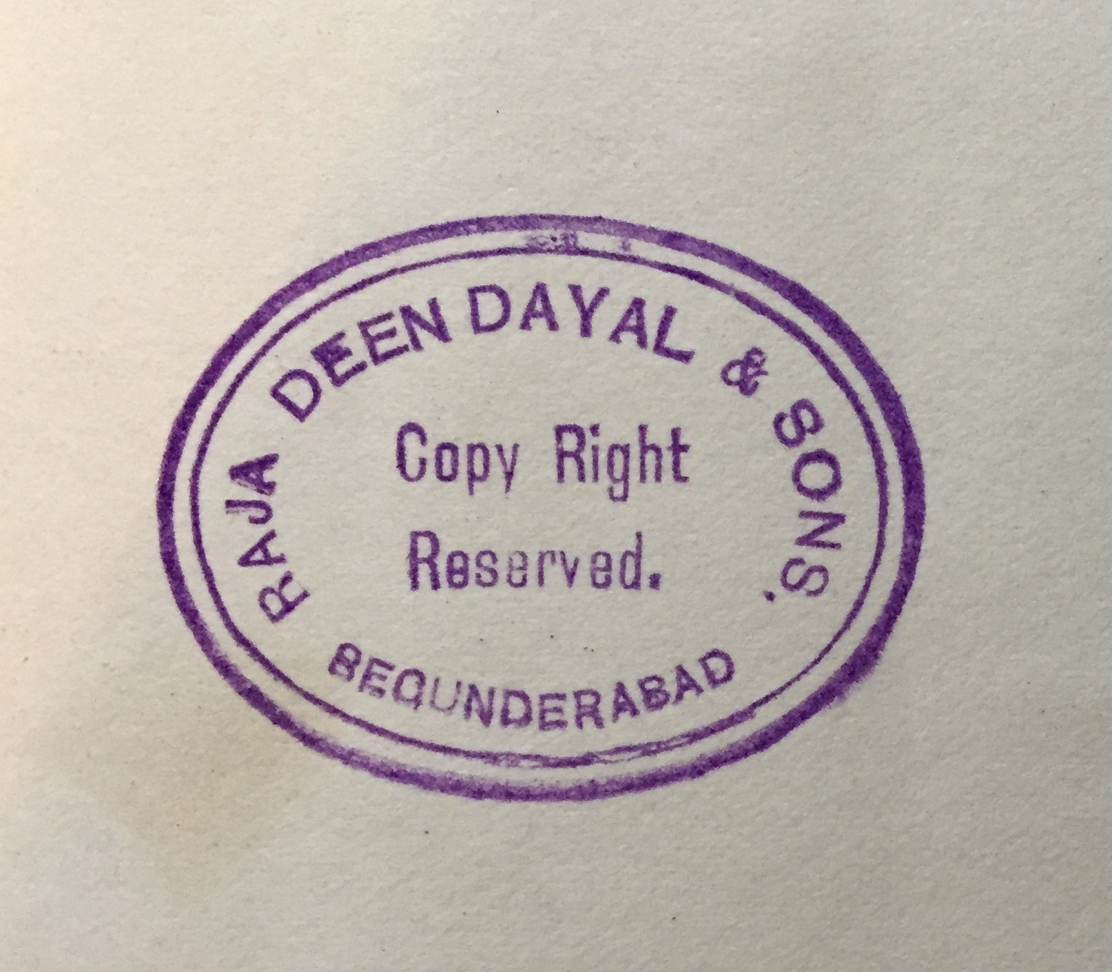 Wet stamp for "Raja Deen Dayal & Sons, Segunderabad"