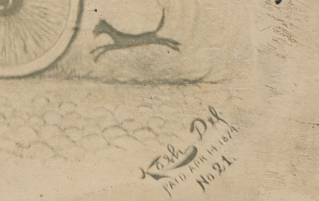 Patent mark on a tintype of a portrait of a man with a caricature foreground