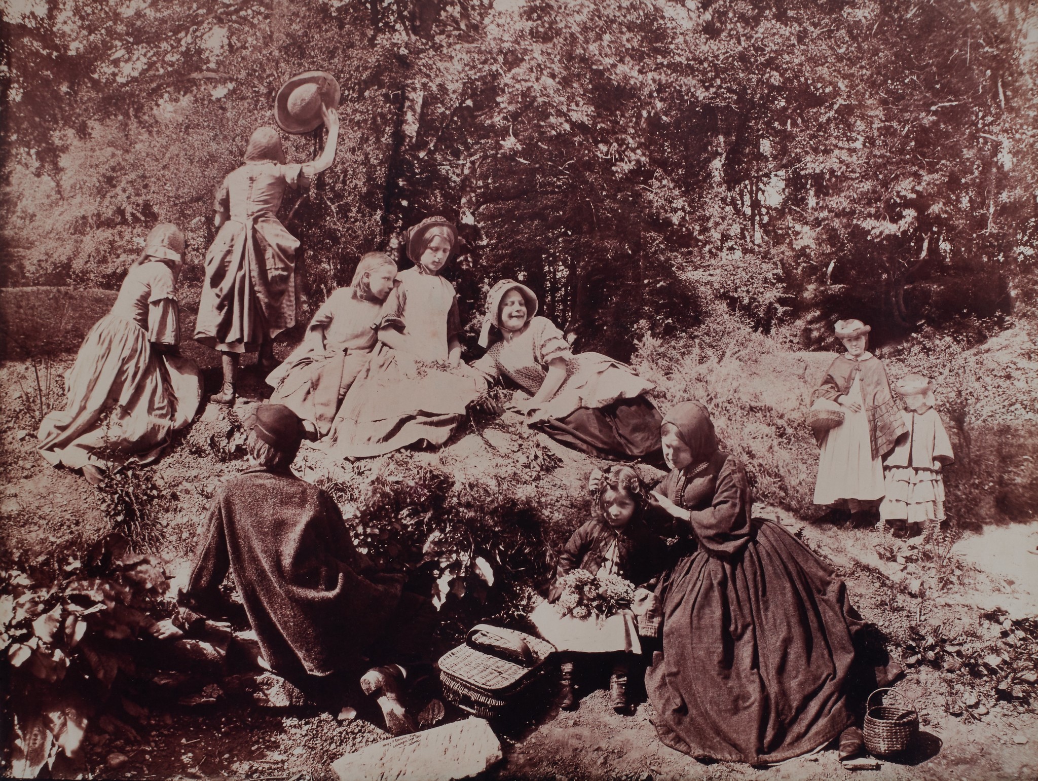 (Patrick Montgomery, 5 October 2021) Over the course of two sunny days in April 1860, Robinson exposed six separate negatives of ten models frolicking in his backyard studio, where he had constructed a fake riverbank from a mound of earth scattered with a few ferns and wild flowers. The 'river' is a ditch filled with waste water from his print-washing machine.