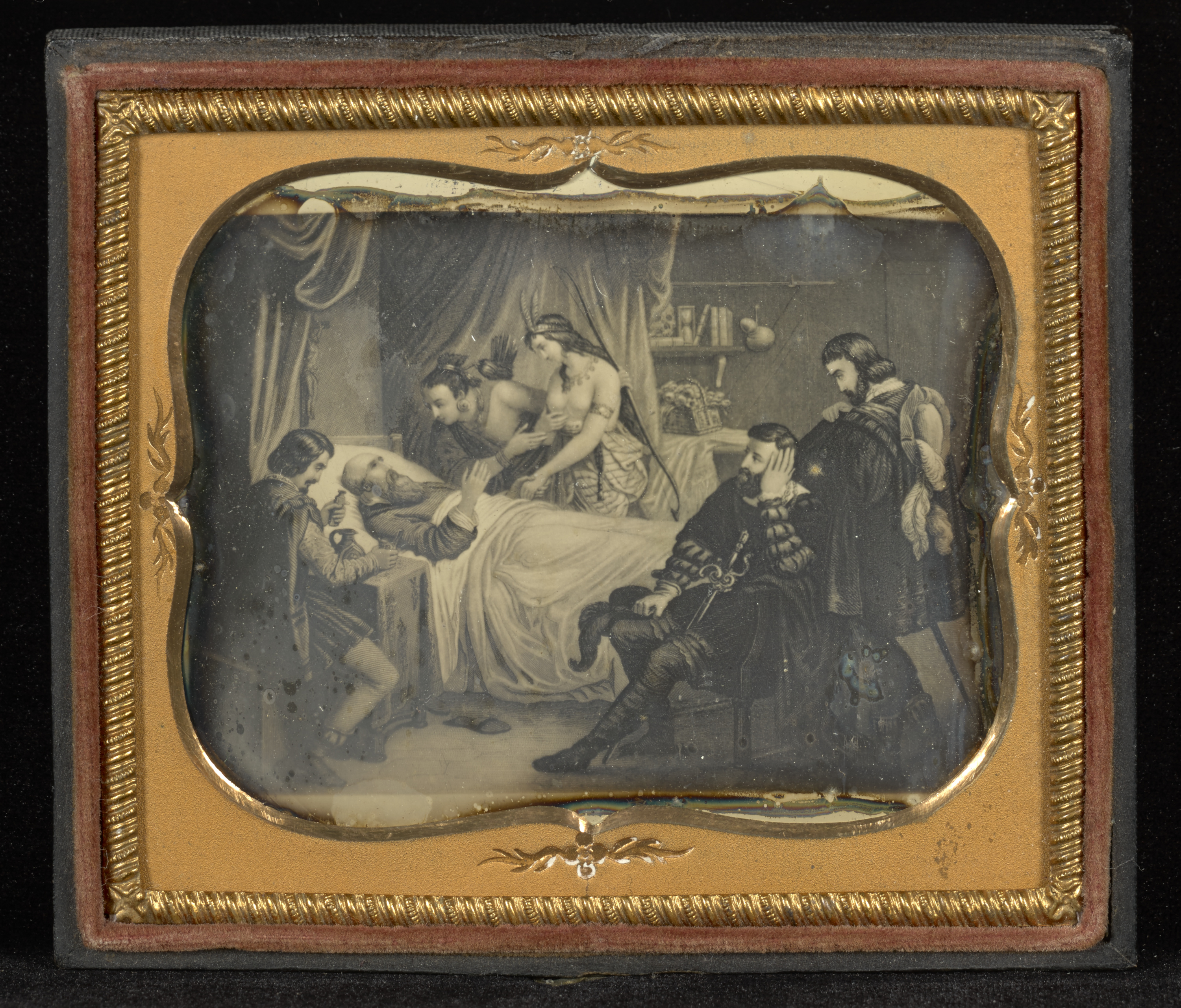 Daguerreotype of an engraving of a painting, "Affection of the Indians for Las Casa." The work depicts two Native Americans and three Spaniards gathered around the deathbed of Bartoleme de Las Casas, a Spanish missionary. Nonpareil brass mat. Leather case with a metal clasp, maroon velvet lining, and a geometric design.