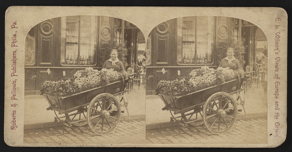 [Woman with cart of flowers on cobblestone street, probably in Europe]