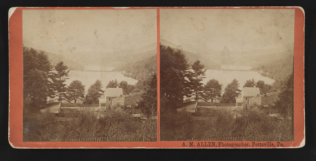 Stereograph shows "views of the park Tumbling Run, located at the southern foot of Sharp Mountain, south of Pottsville, Pa., including a farm on the bank of the twin dams looking east toward Pottsville." Summary taken from https://digital.librarycompany.org (The Library Company of Philadelphia)