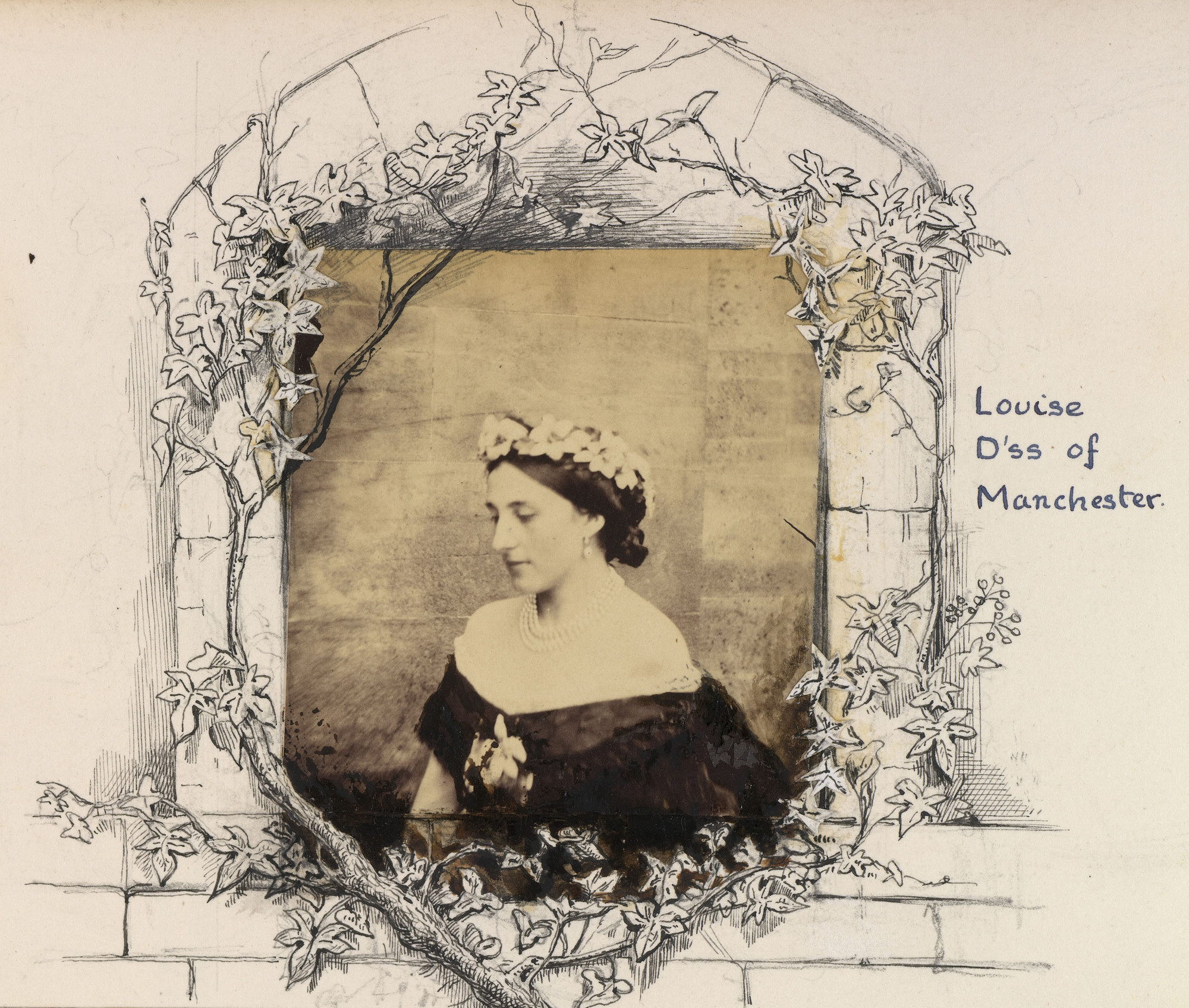 Photograph of a head and shoulders portrait of Louise, Duchess of Manchester. She faces three-quarters left, looking down towards the ground. She wears a pearl necklace and a garland of flowers as a headdress. She also appears to be wearing a dark coloured gown with a flower at her bust, however the photograph has been painted with dark coloured paint over the top of the dress. The photograph is adhered to a page in an album. On the page around the photograph there is a drawing of flowers and branches on a wall. Some flowers have been layered over the edges of the photograph and a branch has been painted across the top left hand corner of the photograph. The Duchess of Manchester was the Mistress of the Robes to Queen Victoria between 1858 and 1859.