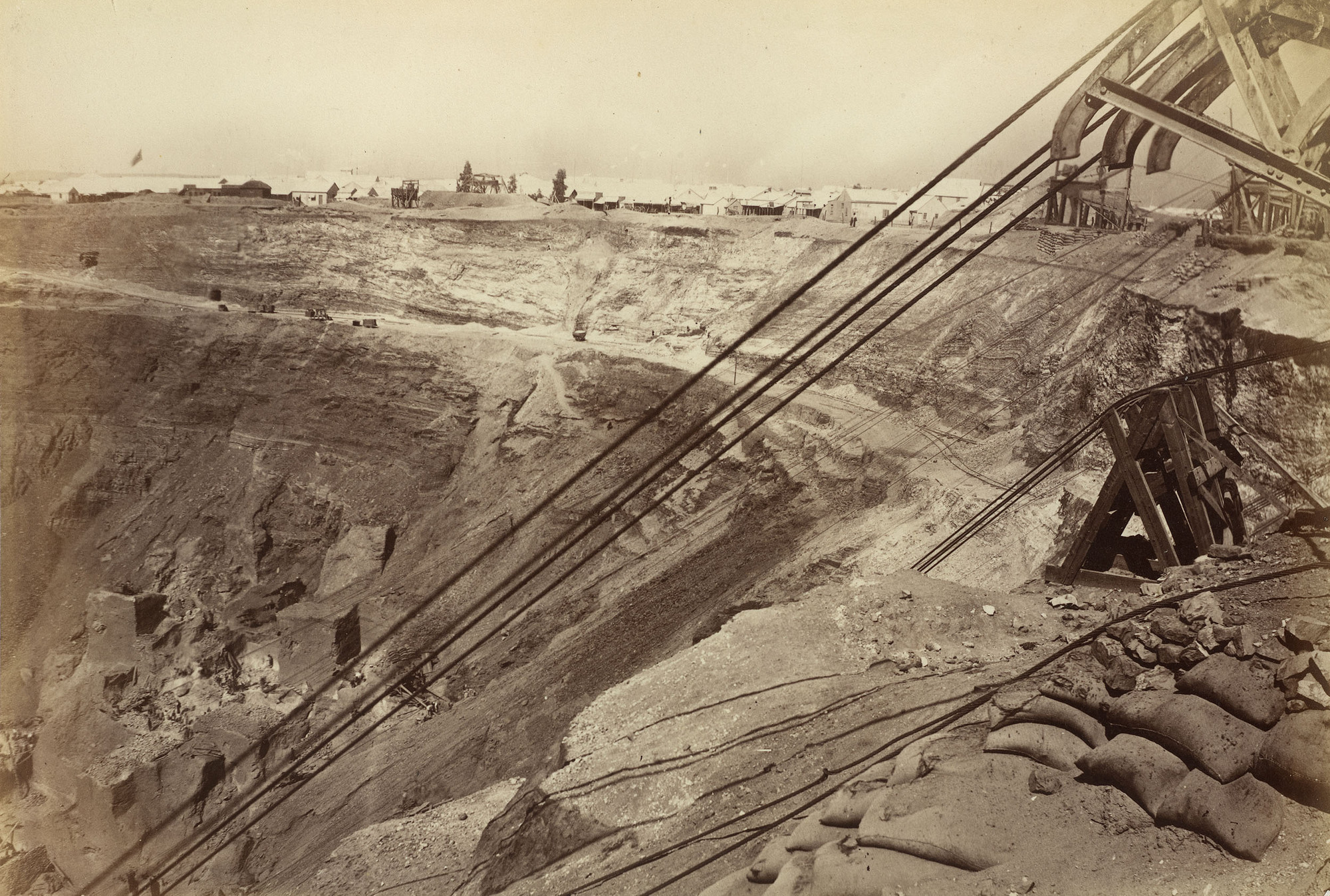 Photograph of the machinery used to hoist and wash diamond soil at a mine in Griqualand-West. There are thick cables in the foreground, attached to machinery lining the edge of the mine to the right. The bottom of the mine has been cut into earth ledges of different sizes. A settlement of wooden huts can be seen beyond the mine. Griqualand-West was a British colony in southern Africa. The discovery of diamonds in the area led to vast excavation sites and the mass immigration of workers.