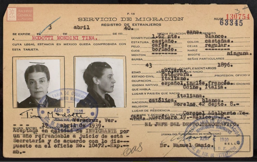 Mexican immigration card for "Modotti Mondini Tina" (num. 130754 / 63345)