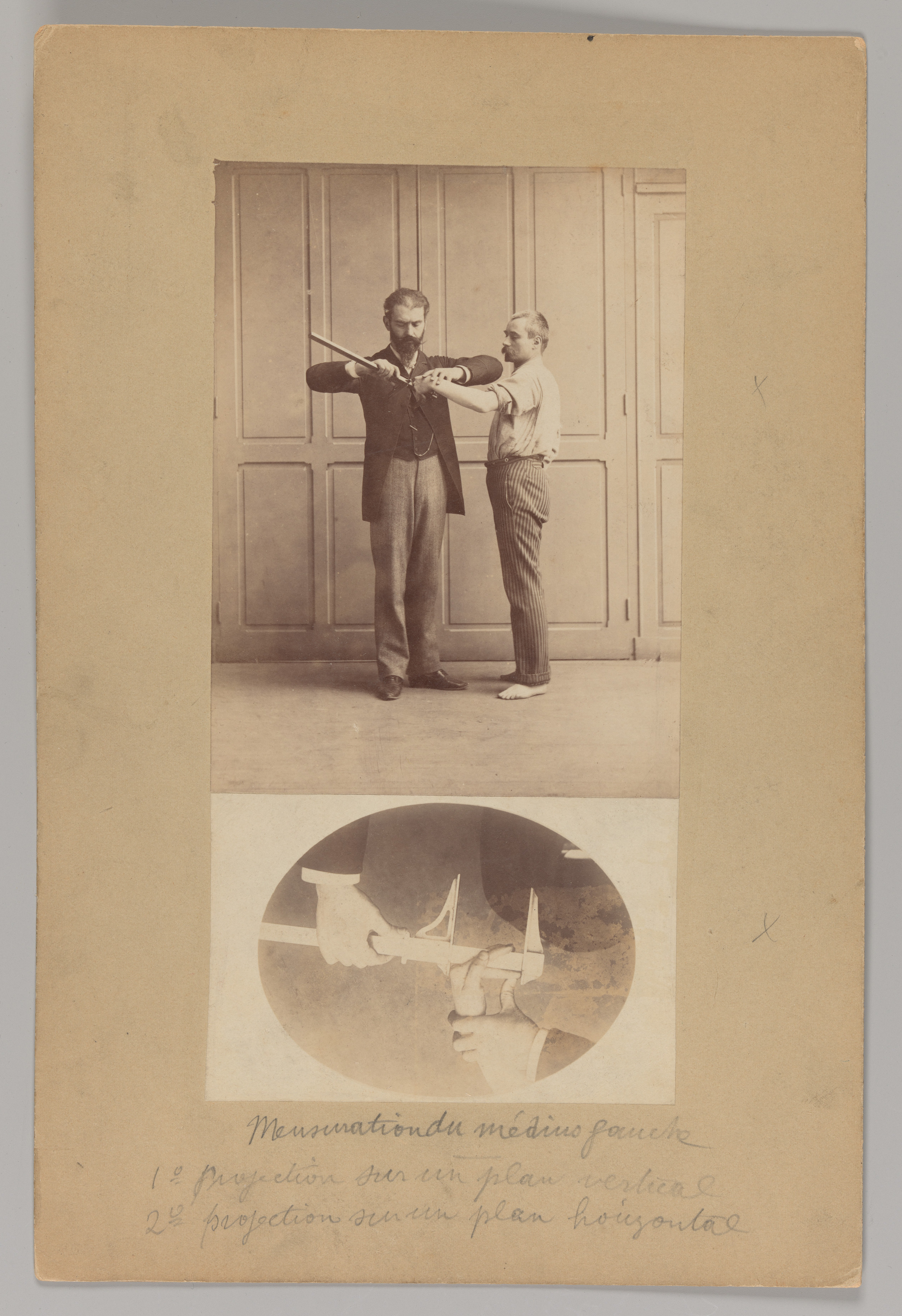 A prisoner being "Bertillonaged" was first subjected to eleven different anthropometric measurements taken with specially designed calipers, gauges, and rulers. To ensure that the results were accurate and consistent, Bertillon meticulously choreographed the movements and gestures of both prisoner and police clerk. These photographs show Bertillon himself demonstrating his technique for measuring the middle finger.