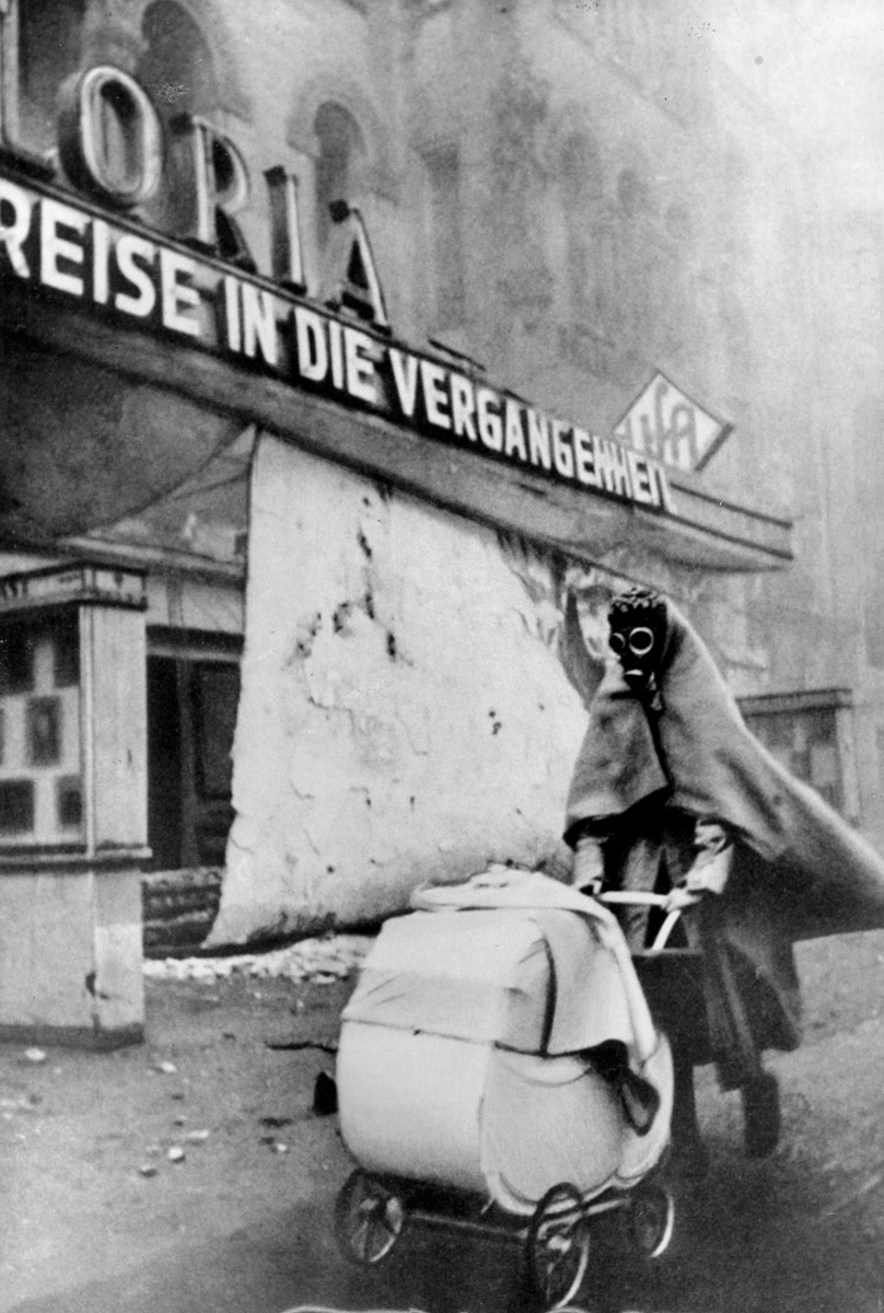 Wolf Strache considered this iconic image taken during WWII one of his best photographs and it has become a symbol of that time. The original negative was confiscated shortly after its production and Strache made another negative in the 1970s with which he made later prints. The sign advertising the film "Reise in die Vergangenheit" (Trip to the Past) makes the image all the more poignant.