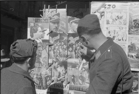 Unidentified photographer 1941, Summer A soldier of facist Italy and a Wehrmacht Luftwaffe soldier in Palermo, Sicily in the summer in 1941, looking at magazines displayed for sale, among them Photograph Creative Commons - Wikipedia A Propaganda Kompanie of the Wehrmacht