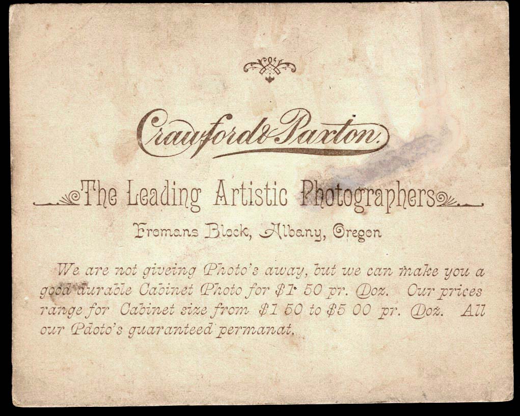 "Crawford and Paxton, The Leading Photographers, Froman's Block, Albany, Oregon"