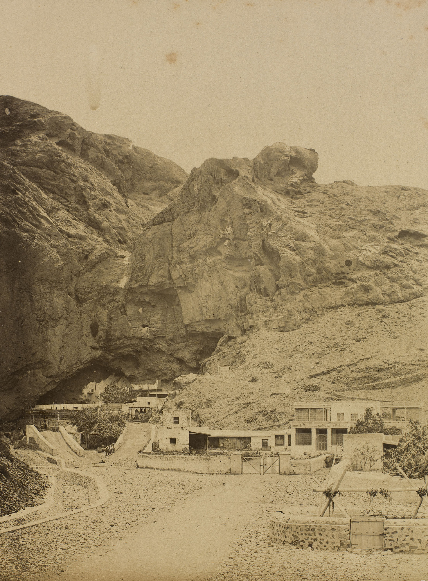 Photograph of Aden, the Roosaf Valley. A large overhang and backdrop of rock with a well at right foreground. A ditch/trench at left foreground. A building within a low walled compound, two covered wells at end of inclined ramps. Trees and buildings behind.