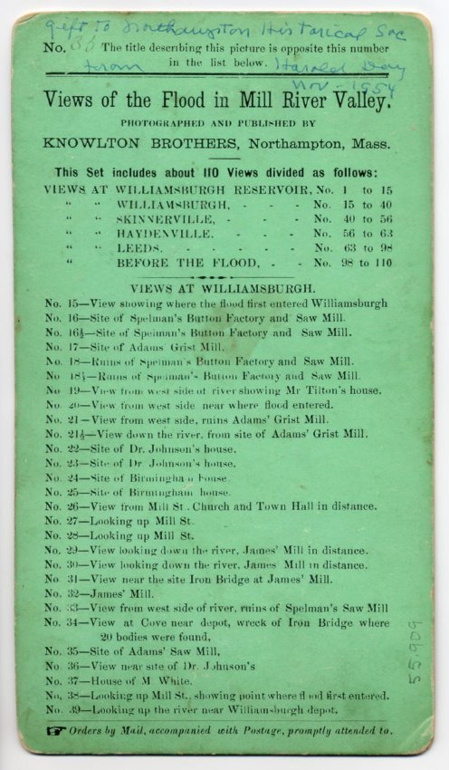 Backlist for "Views of the Flood in Mill Valley, Photographed and Published by Knowlton Brothers, Northampton, Mass."