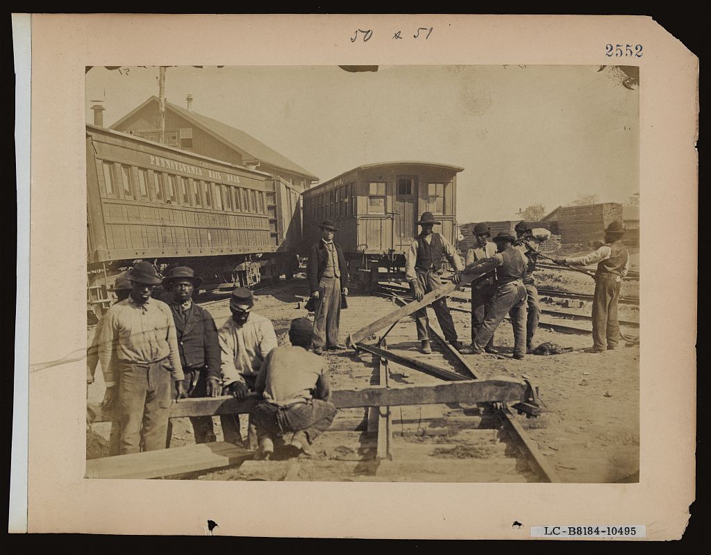 A.J. Russell 1863 (published) [Military railroad operations in northern Virginia: men using levers for loosening rails] [Photographs illustrative of operations in construction and transportation, as used to facilitate the movements of the Armies of the Rappahannock, of Virginia, and of the Potomac ...]