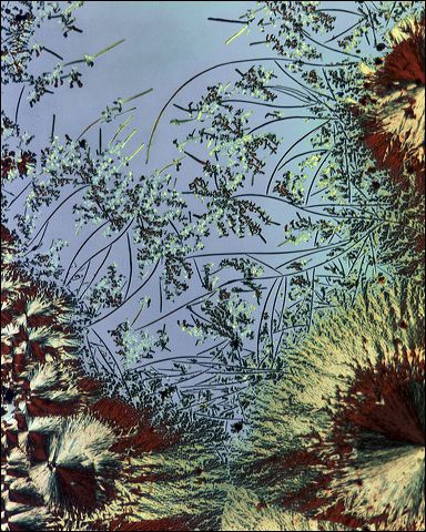 Pigment intermediate GRP 71, structure and formula not known. Crystals grown from solvent film. Polarized light.
