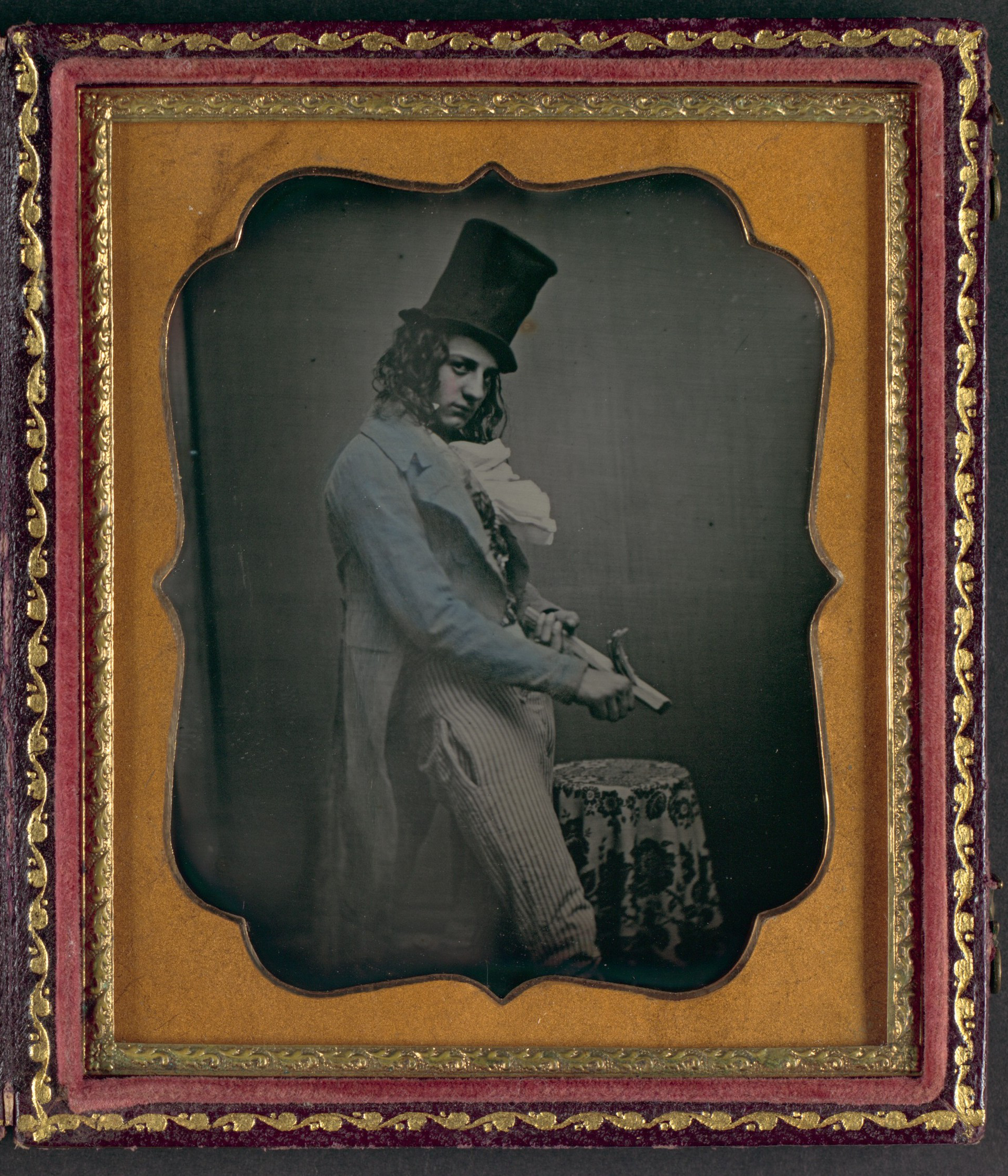 The "wily Yankee" was a popular mid-nineteenth-century stage character from American regional theater. With tricks of cunning and an exaggerated costume (top hat, wide striped pants), this stock player became the visual prototype for America's "Uncle Sam." The motif of the whittler relates to the character's role. Between acts, the Yankee remained on stage, whittled, and told parables. At times, he also flirted with both the women and men in the audience as he suggestively carved a stick at his crotch.
