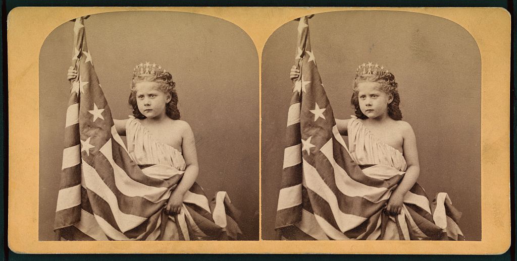 Photograph shows a little girl wearing a gown and crown, unfurling an American flag.