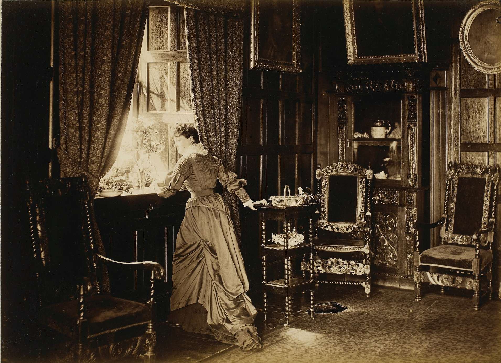 Henry Peach Robinson developed a strong interest in drawing and painting as a child, but spent the early part of his adult life working for booksellers and printers. A strong advocate for the recognition of photography as an art form, he articulated this position in publications such as "Pictorial Effect in Photography" (1869) and "The Elements of a Pictorial Photograph" (1896). This photograph employs many of Robinson's "prescriptions" for composing a pictorial photograph: the massing of "the deepest dark" brought into immediate contact with the highest light, to create "the glamour and witchery of perfect chiaroscuro," repeated forms and repeated lights (the voluminous fabric of the dress and curtains, the ornate chairs, the shafts of sunlight on the woman's face, hands, and the room's furnishings, the patches of light on the carpet and surrounding the pair of slippers awaiting their owner's arrival), and strong diagonals.