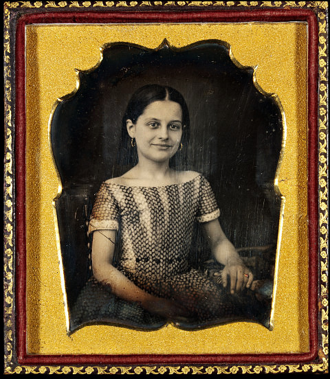 Daguerreotype featuring the portrait of a young girl, wearing her hair loose and hoop earrings. Cased in papier-maché (no lid)