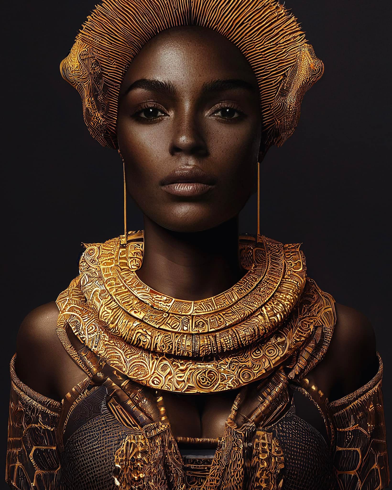 MidJourney (AI), Lance Allen Reis (prompt) 2022, 23 August Untitled [AI generated portrait with post-processing of an African woman with adornment]