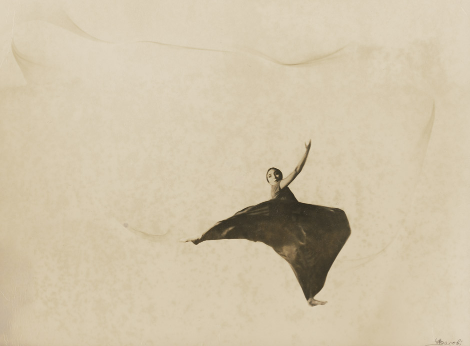 In the 1930s Lotte Jacobi had photographed many well-known figures of modern dance in Berlin such as Claire Bauroff, Vera Skoronel and Harald Kreutzberg. She was particularily interested in the dynamics and abstraction of expressive dance. The image offered here, taken in her New York studio circa 1940, reflects Jacobi's fascination in the combination of the dancing figure of the American dancer Pauline Koner with one of her abstract photogenics to emphasize the flowing movement of modern dance.