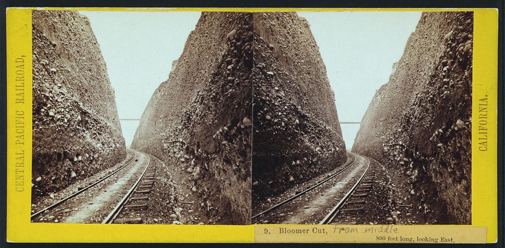 Alfred Hart 1865-1869 Bloomer Cut, 800 feet long, looking east [Central Pacific Railroad, California. Scenes in the Sierra Nevada Mountains. No. 009]