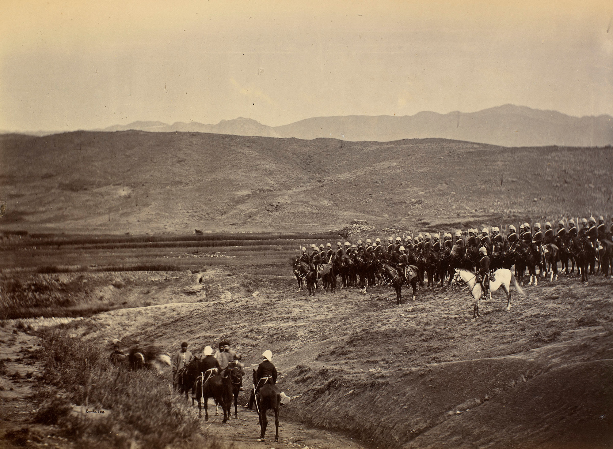 Photograph of the meeting of Emir Mohammad Yaqub Khan (1849-1923) and Sir Pierre Louis Napoleon Cavagnari (1841-79) before the Treaty of Gandamak. Sir Cavagnari, the British representative, and another uniformed officer are mounted on horses in a lane in the foreground, their backs to the camera. The Emir and followers are mounted facing them. On the hillside to the right there is large group of mounted British soldiers. Mountains extend into the distance behind them. The Treaty of Gandamak ended the first phase of the Second Anglo-Afghan War (1878-80). Afghanistan conceded territory to British control and Sir Cavagnari became the British representative in Kabul. He was killed by Afghan forces a few months later and fighting resumed. This photograph was taken by John Burke, who travelled with the Peshawar Valley Field Force during the war.
