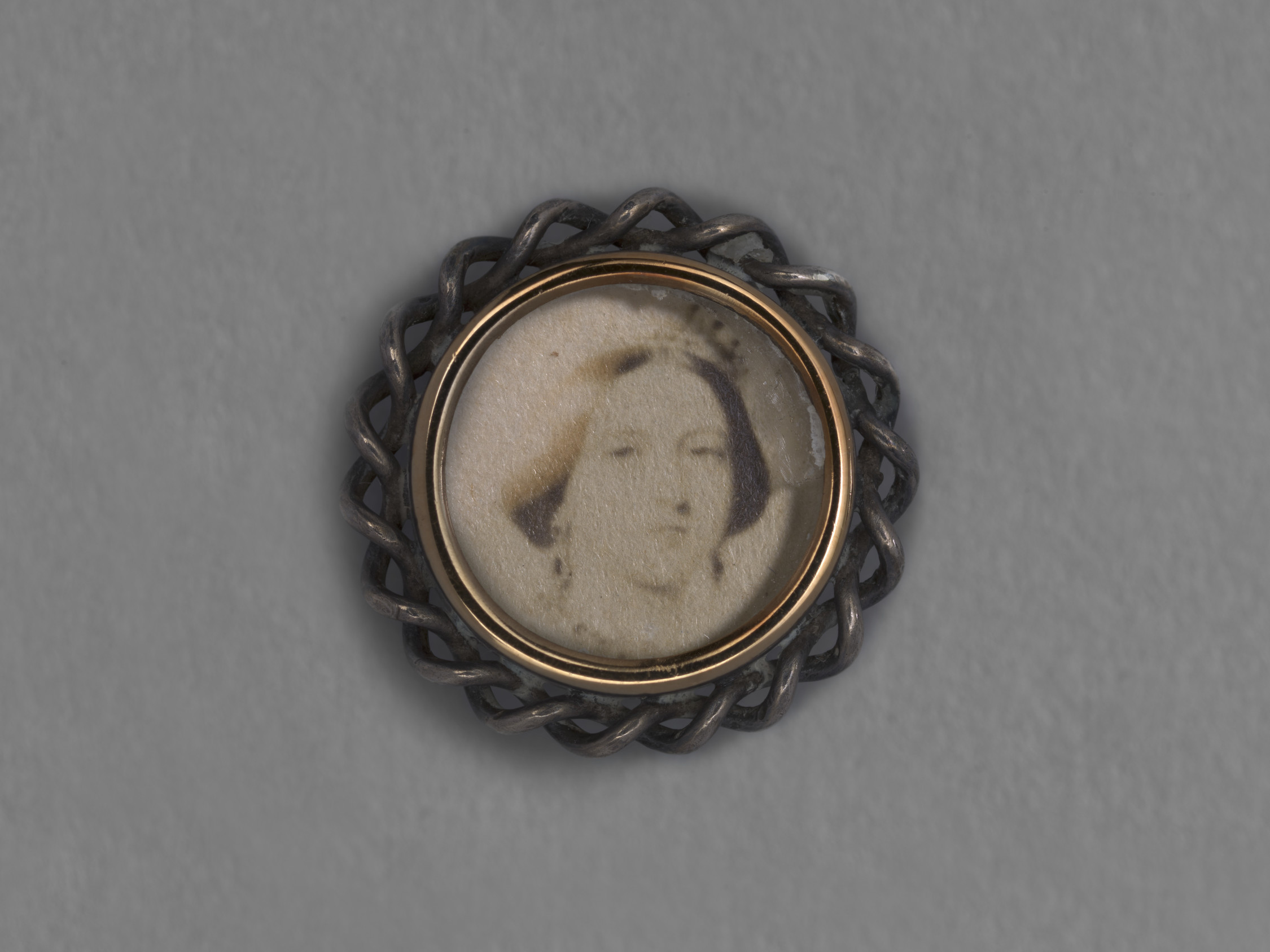 A shirt stud containing a photograph of Queen Victoria. The stud is inscribed on the reverse: Victoria R / Nov 9 / 1854.