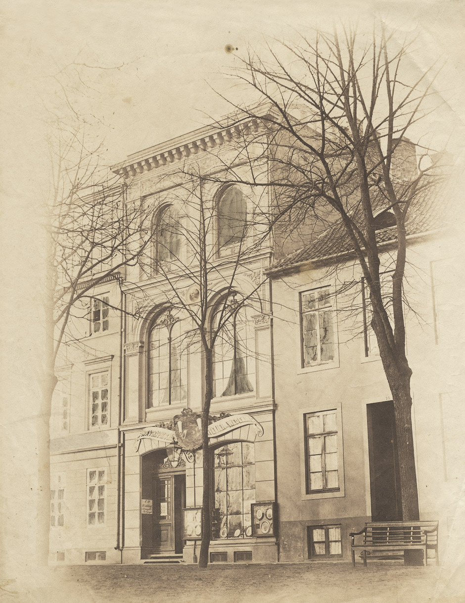 After a longer peregrination August Wedeking, who was trained as a decorative and portrait painter in Munich, returned to his home city of Bremen in 1831 where he worked mainly as a portrait painter. Our photo shows his new 3-story commercial building, which he opened in 1849 (am Wall 74a), with the shop sign Photographisches Atelier von Wedeking and a smaller sign Porträtmaler u. Photograph next to the portal.