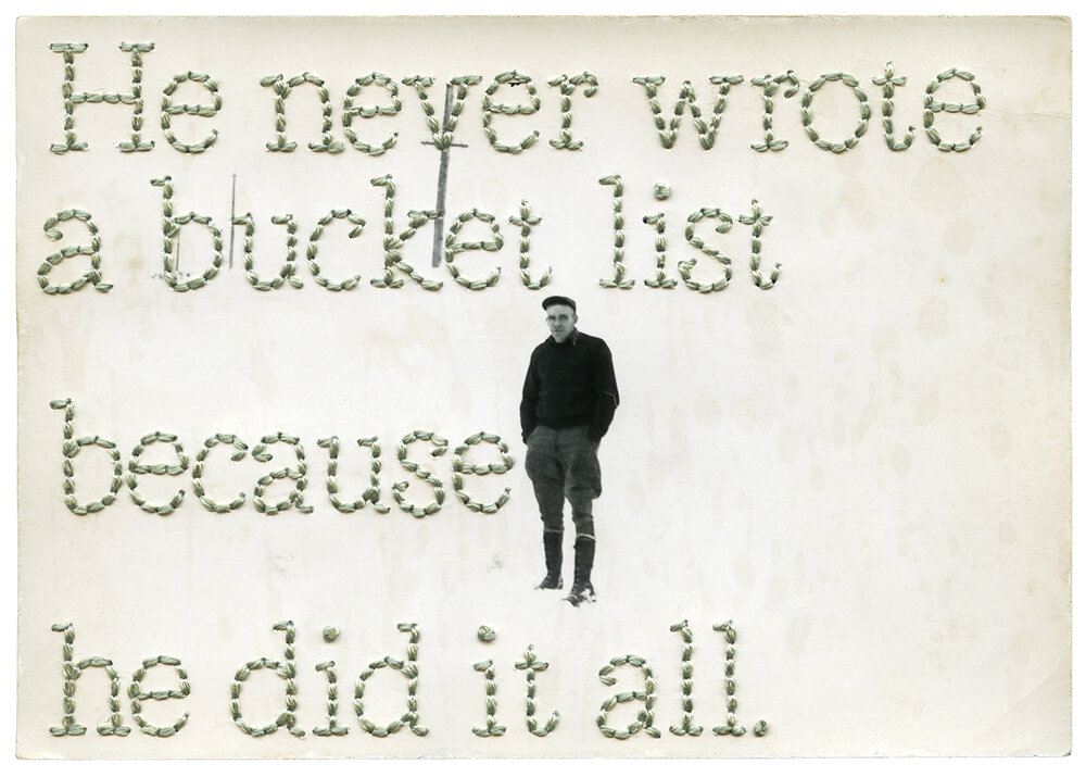 "Her latest series, Remember me: a Collective Narrative in Found Words and Photographs, includes 700 found photographs embroidered with anecdotes culled from family and friend-written obituaries. For Deschner, this process illustrates a collective narrative that reminds us of how we are all connected. "