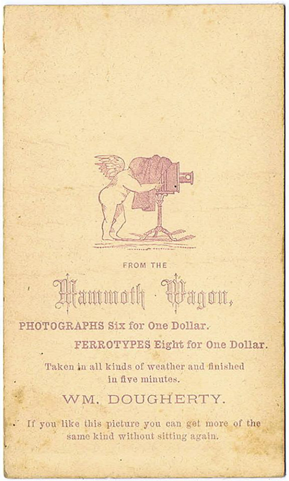 From the Mammoth wagon, Photographs Six for One Dollar. Ferrotypes Eight for One Dollar. Taken in all kinds of weather and finished in five minutes.