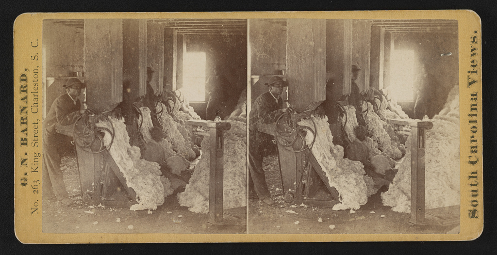 George N. Barnard 1874 Interior view of ginning mills ginning sea island cotton, on Alex. Knox's plantation, Mount Pleasant, near Charleston, S.C.