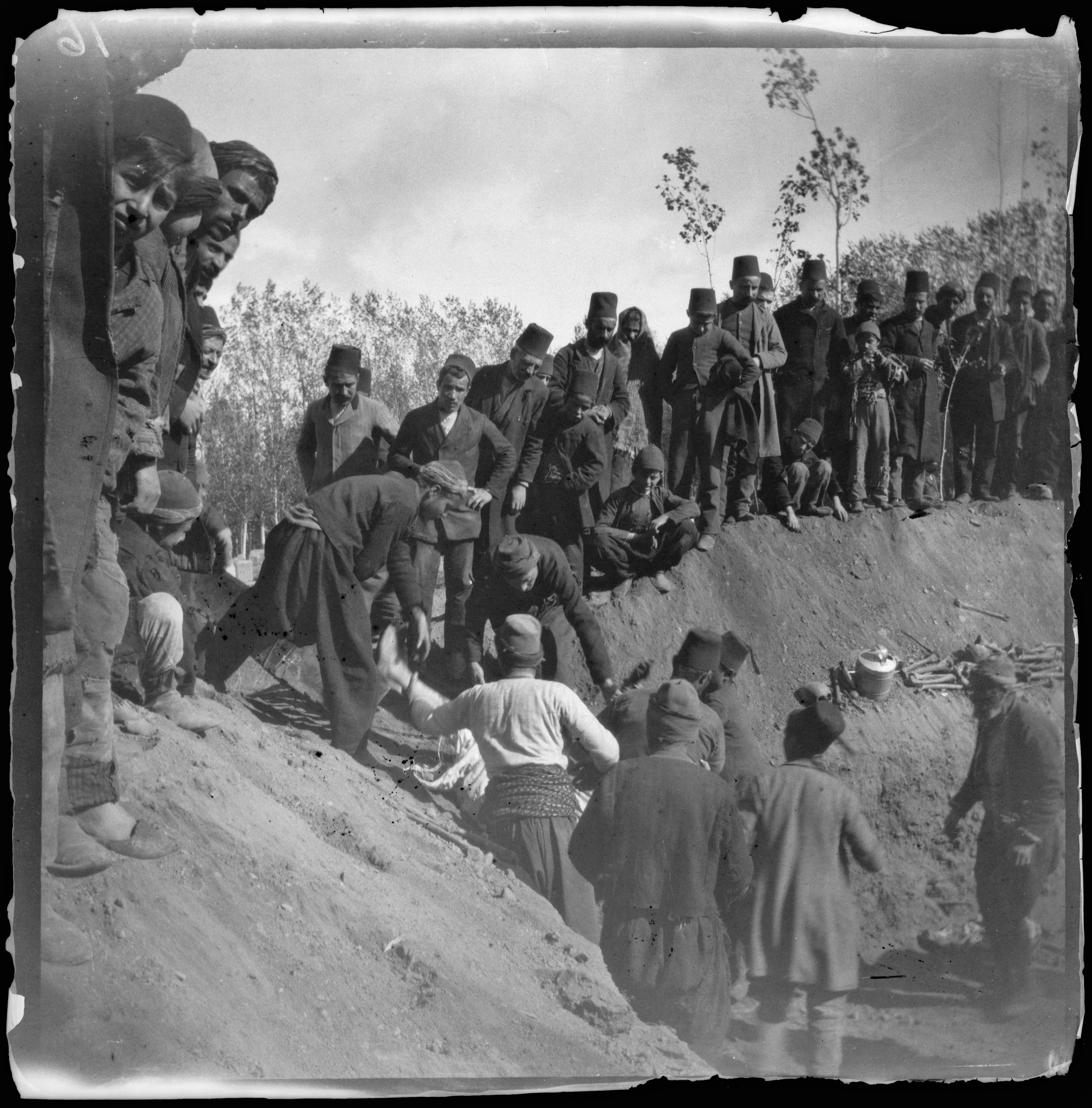 Photograph of an Armenian massacre victim being lowered into a mass grave in the Armenian cemetery in Erzurum as mourners watch. On the right on the ground are human bones from graves disturbed digging the huge fifty-three feet square mass grave.