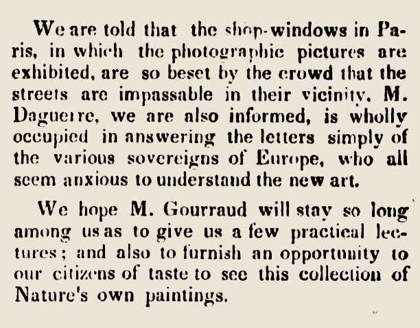 We are told that the shop-windows in Paris, in which the photographic pictures are exhibited, are so beset by the crowd that the streets are impassable in their vicinity. M. Daguerre, we are also informed, is wholly occupied in answering the letters simply of the various sovereigns of Europe, who all seem anxious to understand the new art.