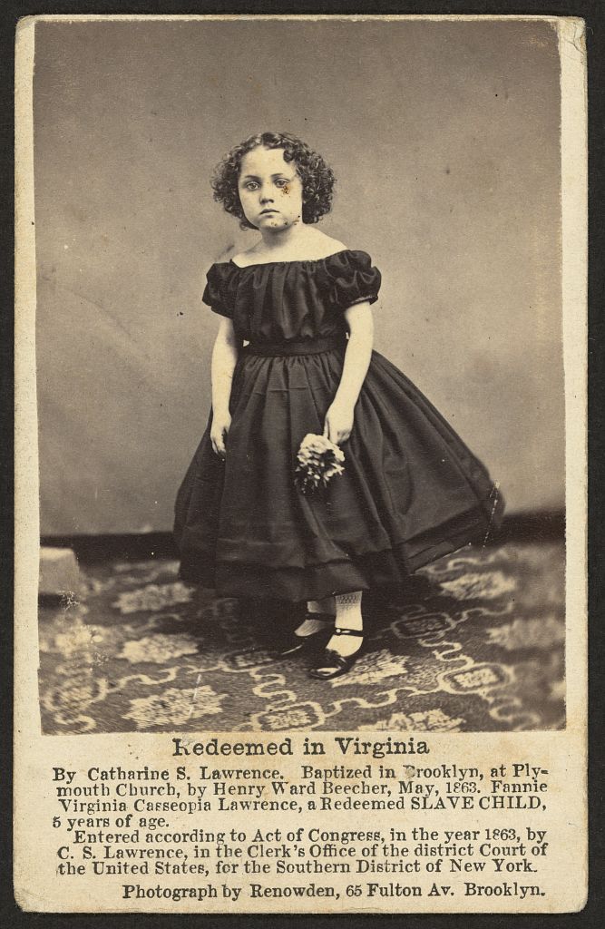 Caption below image: "By Catharine S. Lawrence. Baptized in Brooklyn, at Plymouth Church, by Henry Ward Beecher, May 1863. Fannie Virginia Casseopia Lawrence, a redeemed slave child, 5 years of age".