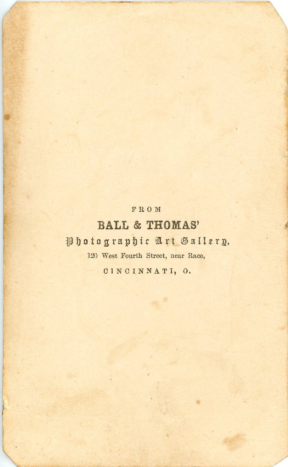 Backmark for "Ball & Thomas' Photographic Art Gallery, 120 West Fourth Street, near Race, Cincinnatim O."
