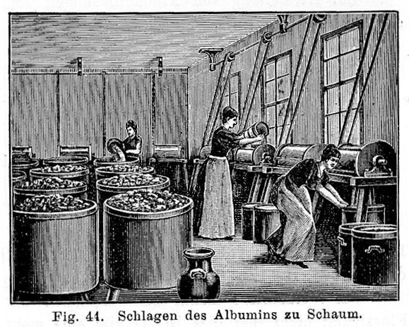 Unidentified artist 1900 (published) The albumen is beaten to a foam using steam-driven churns.