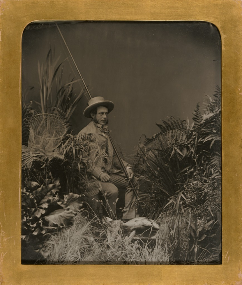 Portrait of a man with muttonchop whiskers surrounded by jungle greenery, posed with fishing gear.