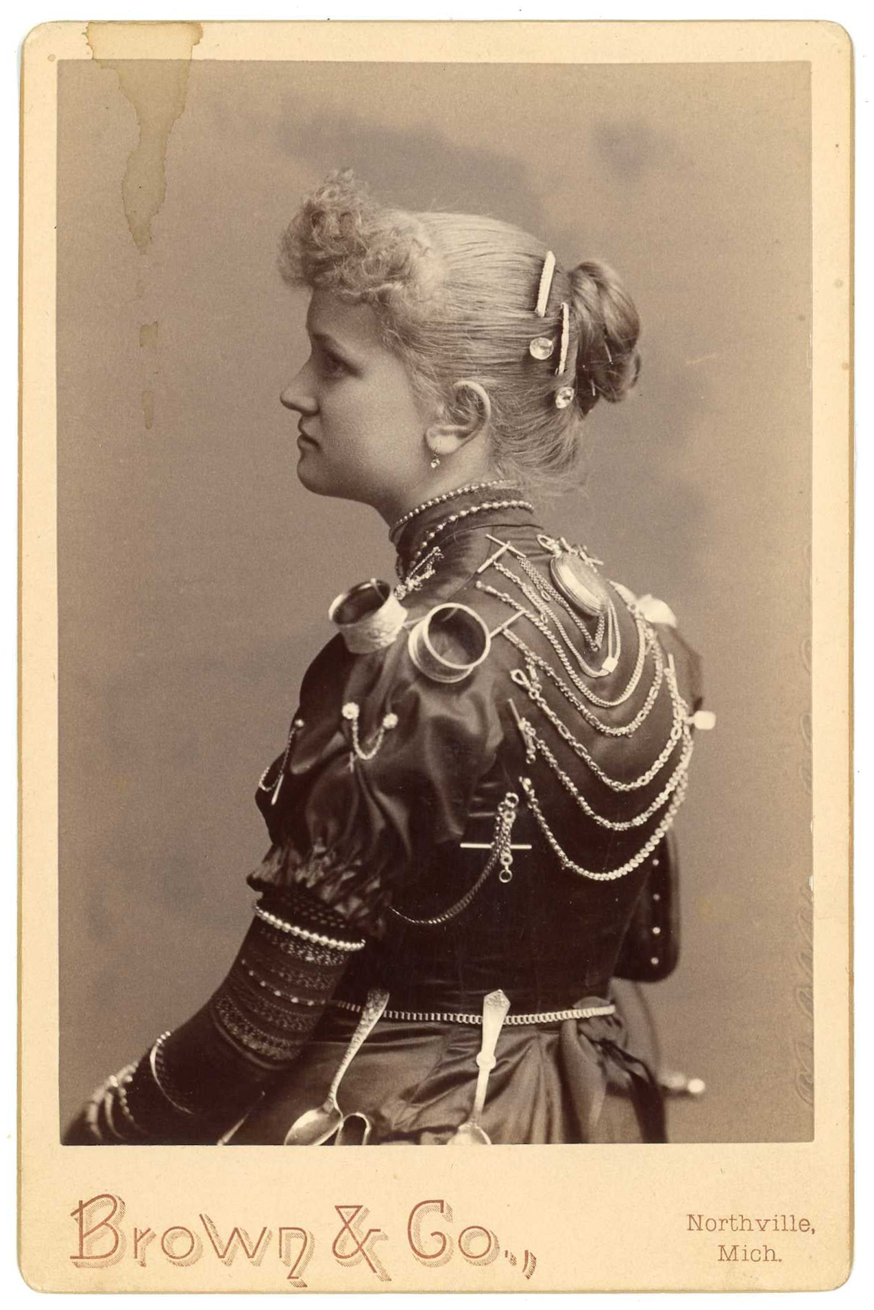 A banner lady adorned with chains, spoons, napkin rings and other items without the banner