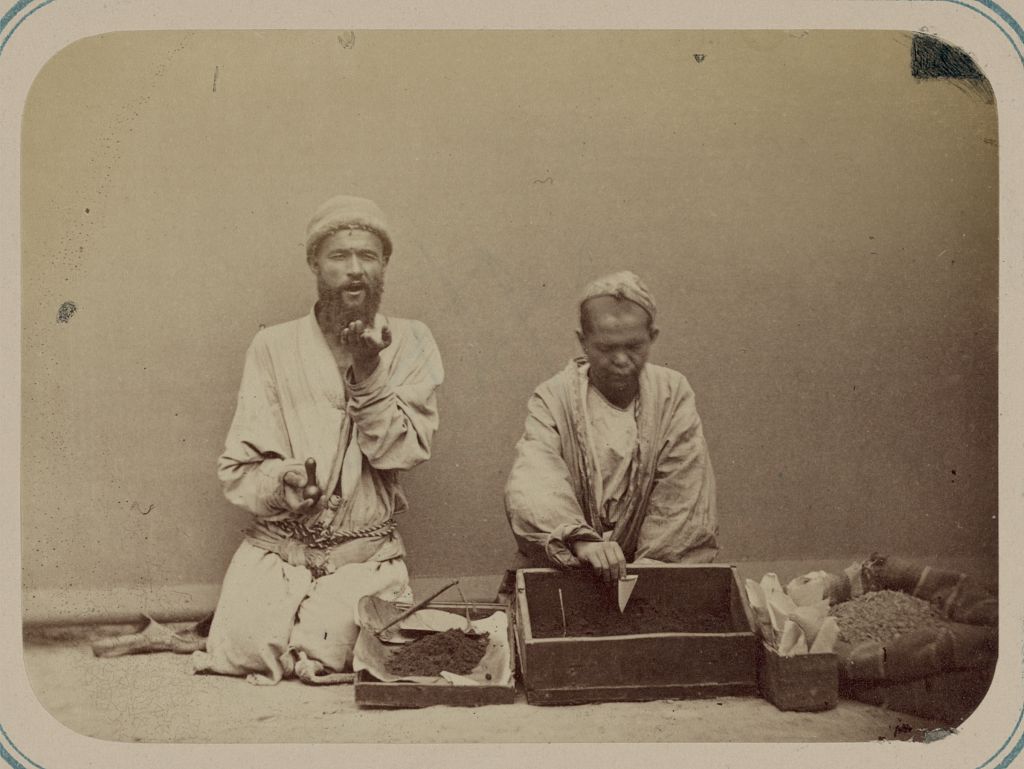 Zaravshan district. Samarkand and the types of people seen in its streets. Selling snuff