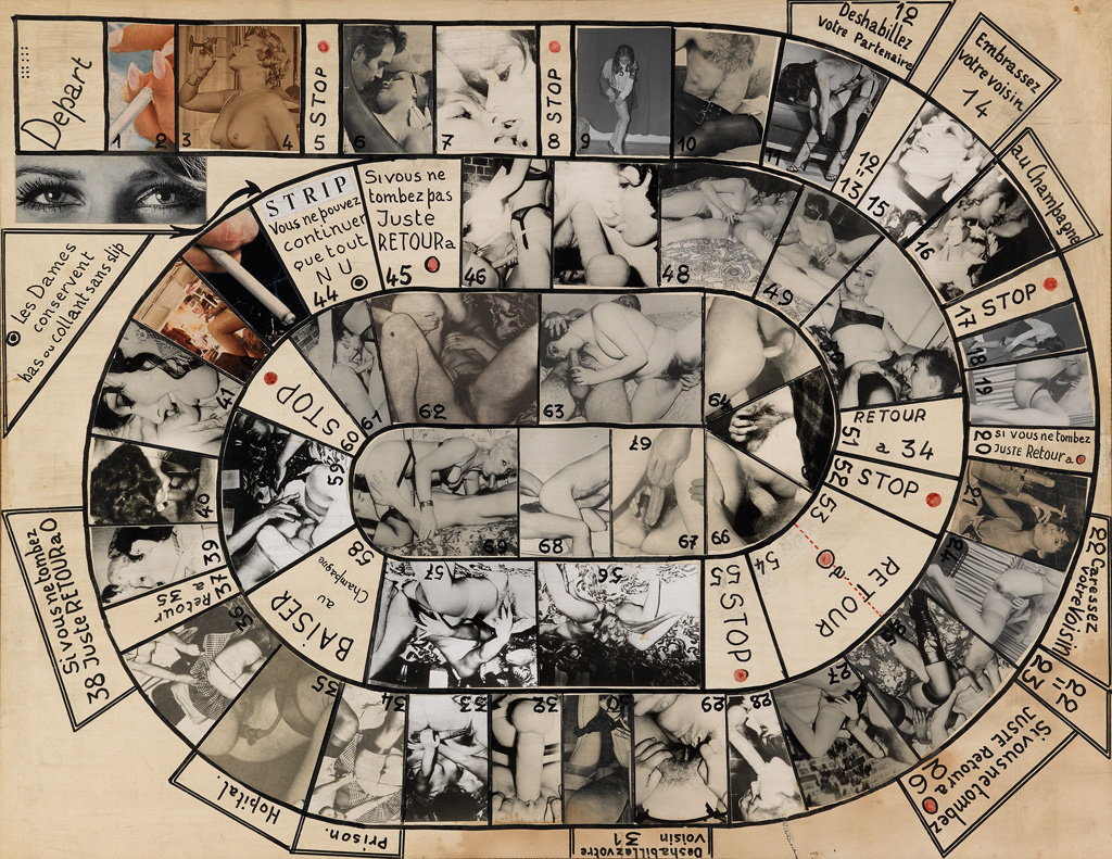 A handmade object, with spaces numbered one through 69 in a spiral path, some spaces with directions (in French) to undress or stop/kiss/caress/return/drink champagne, and others with photographs, most depicting graphic sexual acts, primarily with a male/female couple, but others show 2 women, including detailed close-ups and overall shots of female erotica; also with red dot embellishments.