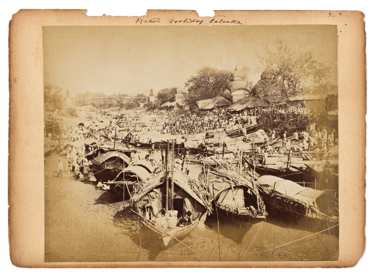 The album depicts major landmarks in each city, including temples, hotels, and colonial government buildings; street and river scenes; and portraits of local figures, including portraits of men and women described as Bhutia. The album features Darjeeling, which was a favorite destination of the colonial British, as well as bustling scenes of bridges and streets, and an Indian juggler. The images are all seemingly hand-selected, the photographs set into a stylized scrapbook. Each are interspersed with meticulously cut and collaged elements, some added embellishments on the mounts surrounding the images, and other full pages of cut elements, including fruit, flowers, bucolic country scenes, and children. Albumen prints, the images measuring 8x6 to 9 1/4x11 1/2 inches (20.3x15.2 to 23.5x29.2 cm.), and the reverse, mounted recto/verso, most with captions, in ink, below the images.