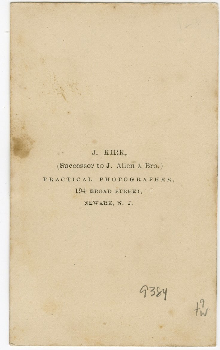Backmark for "J. Kirk, (Successor to J. Allen & Bros.) Practical Photographer, 194 Broad Street, Newark, N.J."