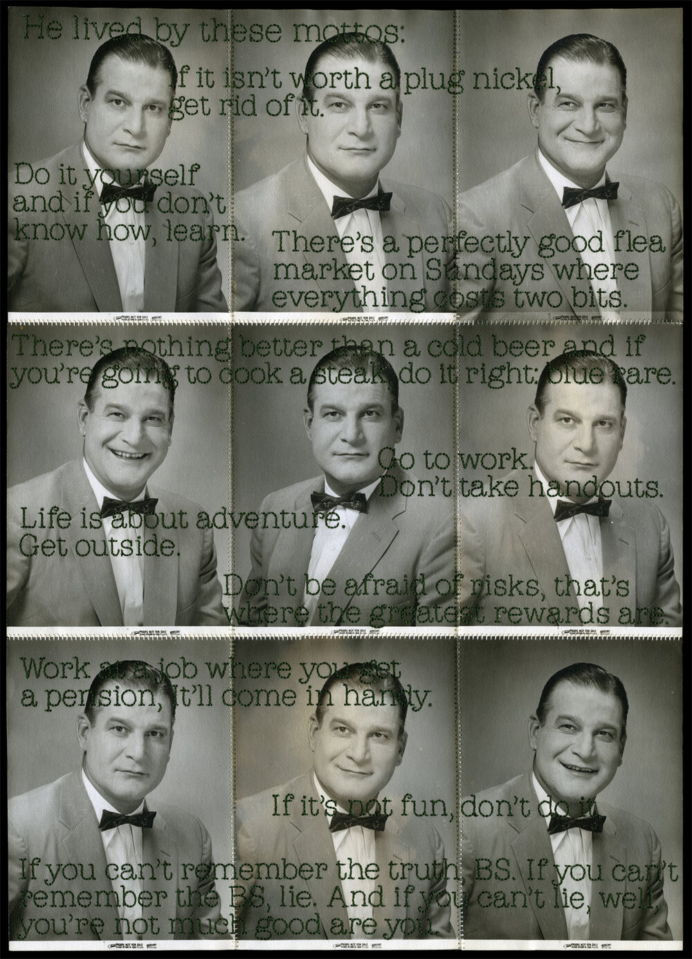 "Her latest series, Remember me: a Collective Narrative in Found Words and Photographs, includes 700 found photographs embroidered with anecdotes culled from family and friend-written obituaries. For Deschner, this process illustrates a collective narrative that reminds us of how we are all connected. "