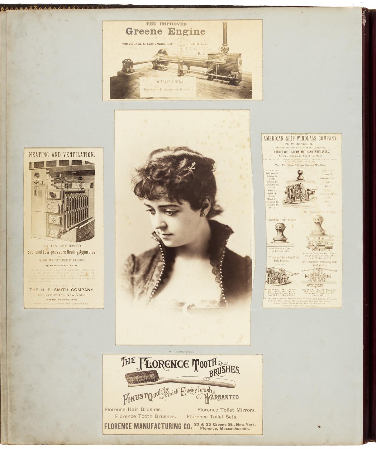 This monumental volume was created by the prominent New York photographer, Napoleon Sarony. Each side of the 23 thick board pages contains a matted albumen photograph and four matted advertising cards. Of the photographs, 42 are large portraits of notable actresses. Portraits of Grover Cleveland and his Vice President, a portrait of the celebrated coronet player Liberati, and a photograph of the Owen paper-making establishment (possibly the producer of this album) are also included. Of the 184 advertisements, 91 are photographs, the others are either engraved, lithographed, or chromolithographed. The large photographs measure 11½ x 6¾ inches (292 x 171 mm.), while the advertisements are mostly 8 x 4 inches (203 x 102 mm.) or the reverse. Produced to sit in the lobby or bar of pre-eminent hotels, art albums were a kind of concierge service, created to entertain and inform visitors of the businesses and pleasures associated with these exclusive establishments. This album is filled with seductive portraits of the stars of the Belle Epoque, including Fannie Davenport, Adelina Patti, Lilly Langtry, Ada Rehan, Lotta Crabtree, Modjeska, Ellen Terry, and Lillian Russell, plus dozens of advertisements for goods and services. All were posed and photographed by the greatest photographer of the American theater, Napoleon Sarony (1821-1896). He established a studio on Broadway in New York in 1866 and for the next thirty years Sarony photographed virtually every actor and actress working on the New York Stage. The Hoffman House was located on Broadway between 24th Street and 25th Street. Built in 1864, it quickly became the informal meeting place for the Democratic Party in New York. Grover Cleveland stopped there frequently, and was living there when he was elected to the Presidency for his second term. General Benjamin Butler and General Winfield Scott made the hotel their home on several occasions, and William Randolph Hearst lived at the Hoffman when he first came to New York City. Edward S. Stokes, who shot financier James Fisk, Jr., became a partner in the hotel, serving as general manager until 1897. The elegant barroom with its shocking painting Nymphs and Satyrs by Bougereau, became a major tourist attraction. Due to their large size and small number, hotel art albums" rarely survived. We have located two others in public institutions. One for the Parker House of Boston is at Brown University, and the other for the Ponce De Leon Hotel of Saint Augustine, Florida is at Jacksonville University.